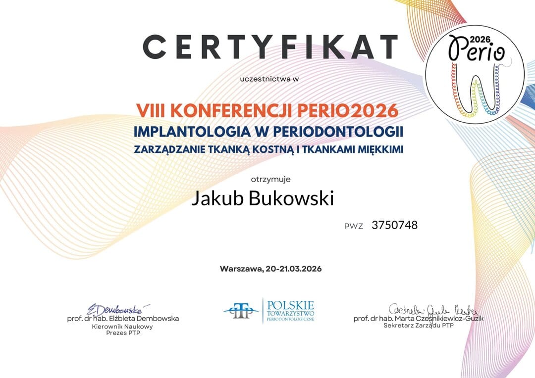 Jest członkiem Polskiego Towarzystwa Periodontologii oraz European Federation of Periodontology. Regularnie uczestniczy w licznych kursach i szkoleniach z zakresu periodontologii oraz diagnostyki i leczenia chorób błony śluzowej jamy ustnej, stale poszerzając swoją wiedzę i umiejętności.