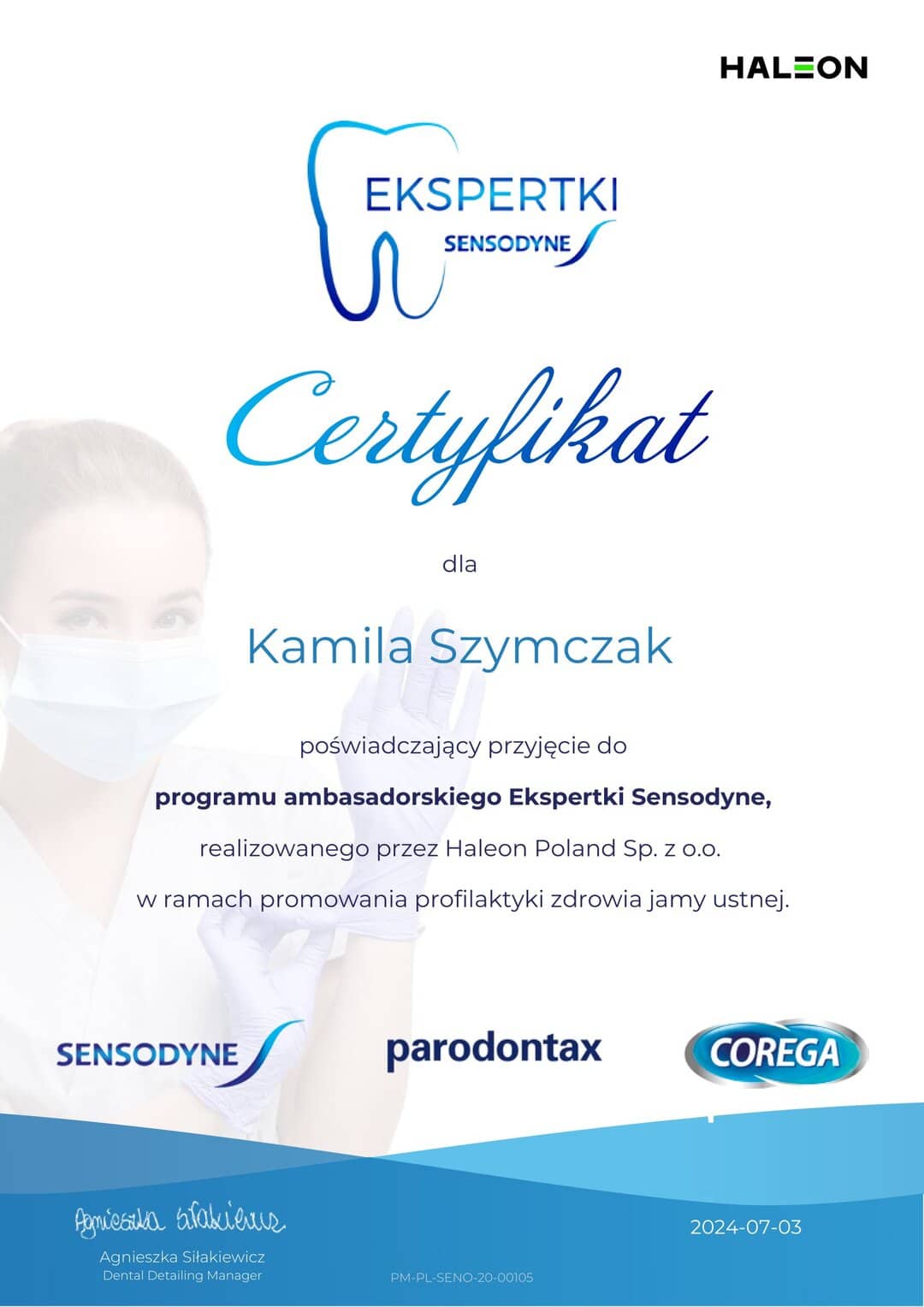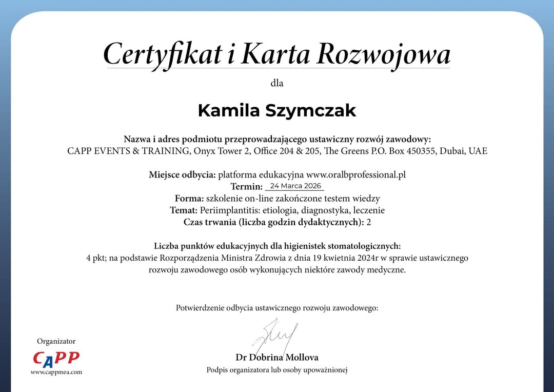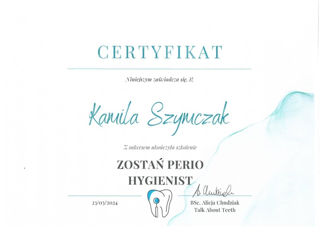 W swojej pracy pragnie dzielić się swoją pasją oraz polepszać stan i higienę jamy ustnej swoich Pacjentów. Najprzyjemniejszym uczuciem w pracy jest dla niej moment, gdy widzi piękny i biały uśmiech Pacjenta, jego zadowolenie z wizyty oraz chęć powrotu do gabinetu.