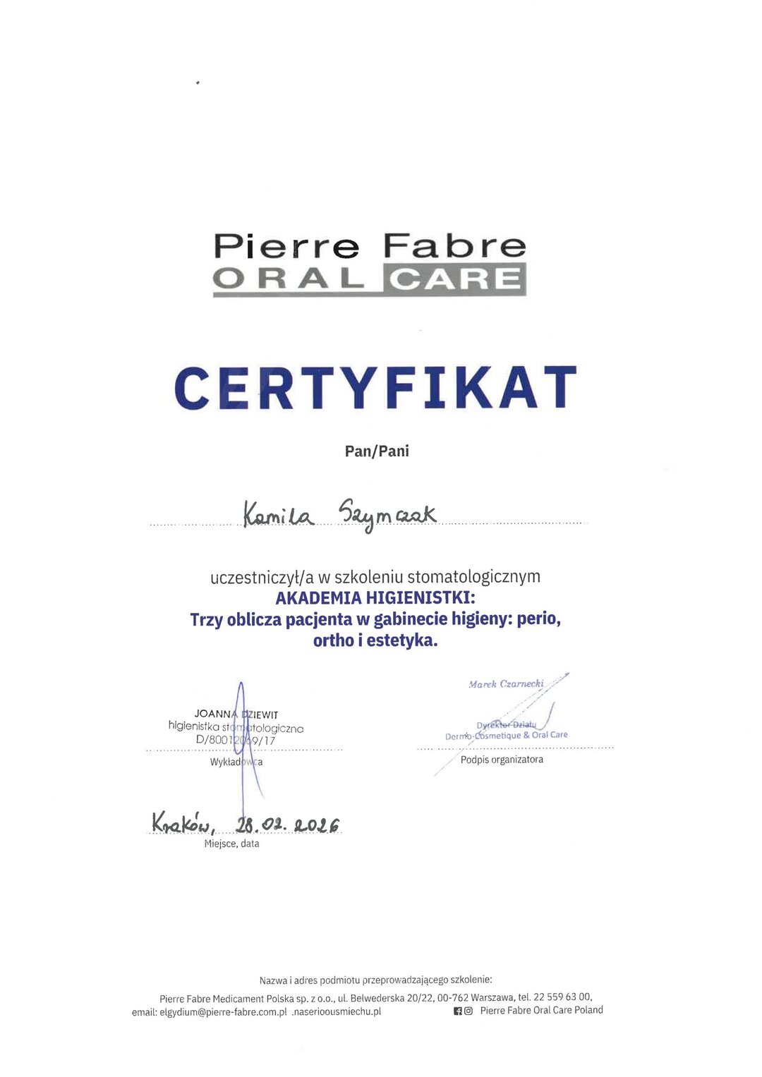Jako higienistka stomatologiczna wykonuje profesjonalne zabiegi higienizacyjne, na które składają się: badanie Pacjenta z wybarwianiem płytki nazębnej, skaling ultradźwiękowy, piaskowanie, polerowanie oraz fluoryzacja wzmacniająca szkliwo. Do każdego Pacjenta podchodzi indywidualnie. Stawia przede wszystkim na jego komfort. Aby zapewnić jak największą dokładność wykonywanego zabiegu, pracuje w powiększeniu lup zabiegowych lub mikroskopu stomatologicznego. Odpowiednio dobrany instruktaż higieny jest kluczem do sukcesu, dlatego po każdej wizycie omawia z Pacjentem najbardziej efektywne metody dbania o zęby.